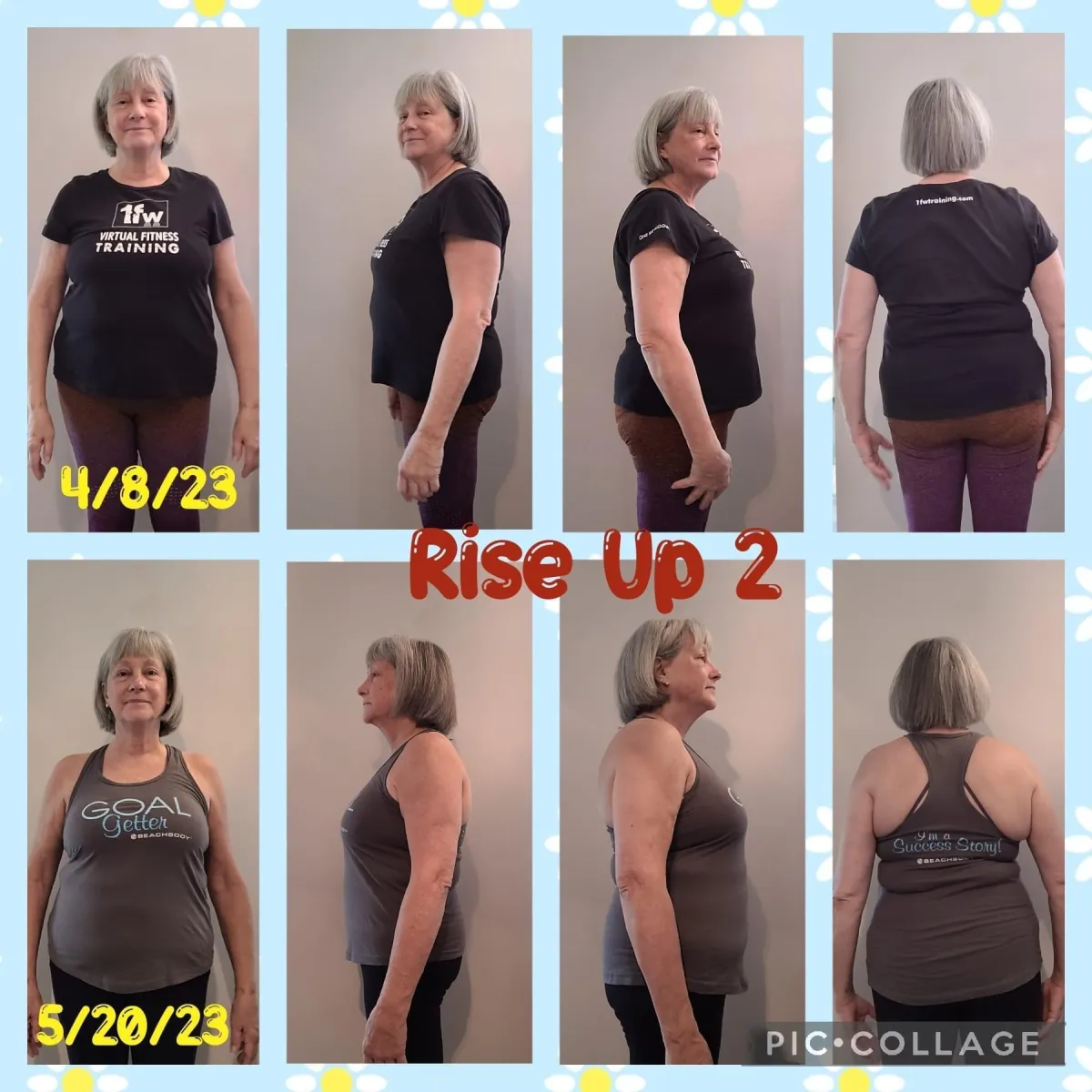 These pictures were taken 5 weeks apart. 13 lbs down, 10+inches gone, clothes fit better, skin is better, eating healthy almost 100%, walking and strength training 3 days a week! I will keep up with program over the summer and hope to see many of you in the next Rise. Thank you to Michelle Steinke-Baumgard and Keith for kick starting my journey!